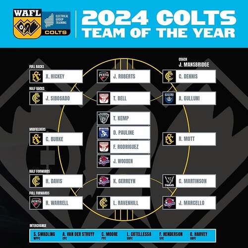 Congratulations Jacob Roberts on his debut in a 1st semi final. Made the 2024 Colts team of the year at full back along with Cooper Moore and Robert Warrell. 190cm from Northam Saints.