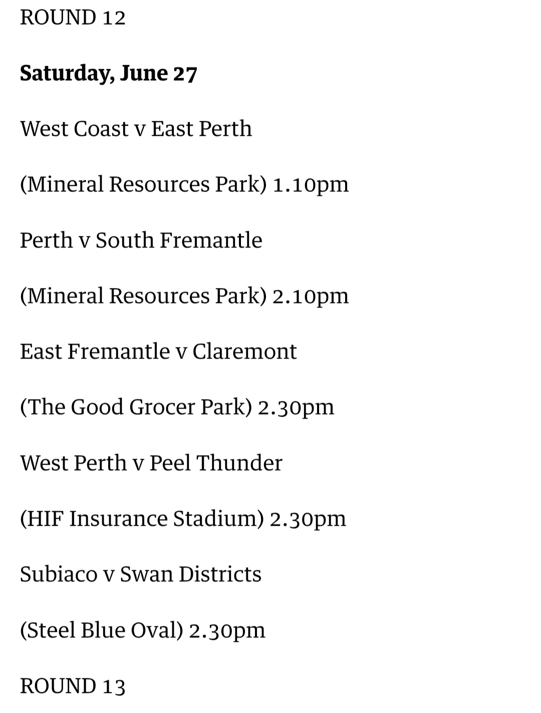 March 14. Peel v Perth, West Perth v East Perth, East Frem v Swans, South v West Coast, Subi v Claremont.